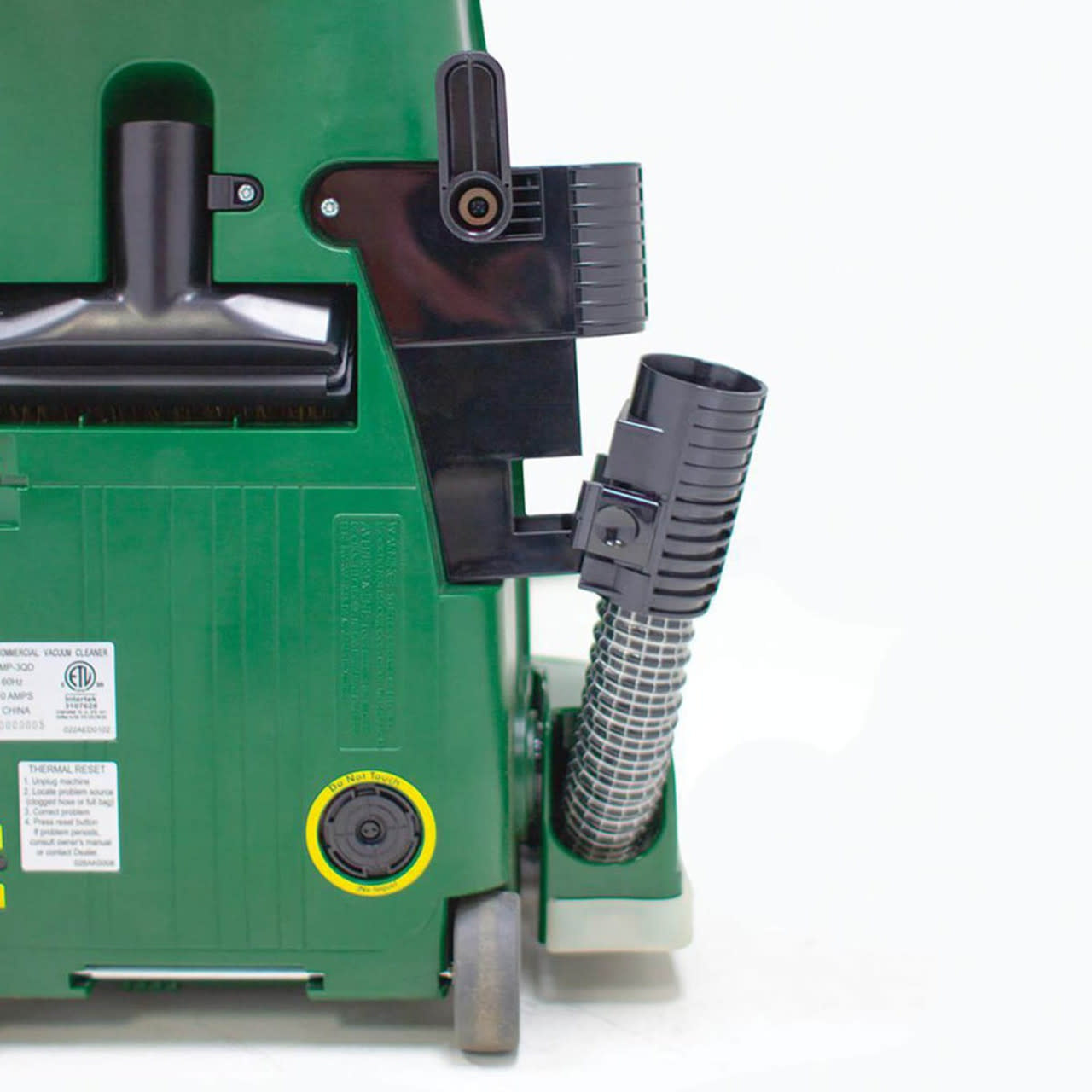 For your satisfaction, this vacuum comes with 4 rubber rear wheels with brass brushings that allow you to easily maneuver it over various surfaces. It also features a 14" nozzle with riveted bumper, which keeps the overall noise level low. This vacuum is designed for front and side edge cleaning.