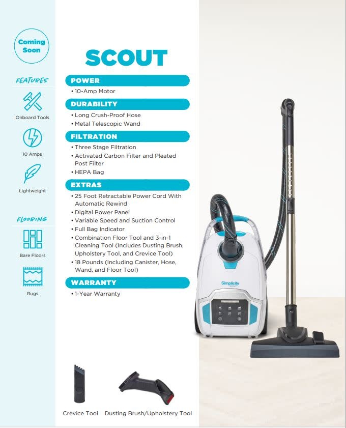 The lightweight yet powerful Scout canister vacuum is the trusty cleaning partner that puts control at your fingertips no matter the terrain. Use the digital control panel to choose your power level based on the mess size and floor type: with its large vinyl whees and single caster, the Scout smoothly and quietly navigates bare floors and rugs with a 25-foot retractable cord.